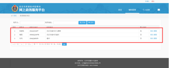 进入网上政务服务平台首页,右上方点击“辅助管理”-“地址管理”,界面跳转到“快递地址列表”。