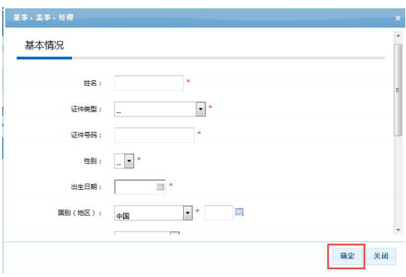 在“董事、监事、经理”标签页中,点击【+添加人员】按钮进入高管人员填写页面,分别填写法定代表人及其他高管人员的基本信息、任职情况信息等,然后点击【确定】按钮将信息提交。如下图。
