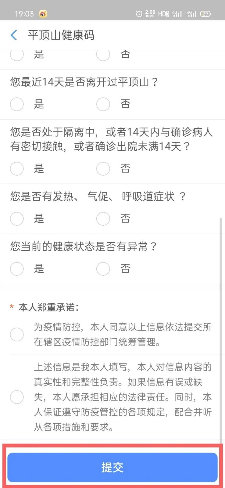 2、在健康申请页,选择城市,如实填写健康状况,确认填报的健康信息属实后提交即可领取成功。