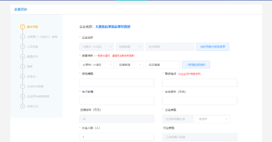 进入设立环节后,我们第一步是需要完成基本信息的录入,申请人要逐个完善相应的内容,如图所示。
