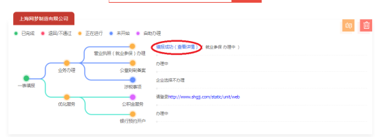 1.2 若您在办理进度跟踪中,查询到营业执照(就业参保)环节状态显示“填报成功(查看详情)”的,点击蓝色的“填报成功(查看详情)”字样,即可按需选择无纸化全程电子化登记方式开展登记。