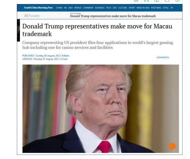 《新闻周刊》称,特朗普对澳门的兴趣至少已经十年了。2006年,一家名为“特朗普有限公司”(Trump Companhia Limitada)的餐饮公司在澳门注册成立。而2006年之后,特朗普本人要求在澳门申请注册“唐纳德·特朗普”、“特朗普大厦”及“特朗普国际酒店”等三个商标,2012年获澳门特区政府经济局批准。随后,特朗普起诉前述“特朗普有限公司”,并于2016年5月赢得这场官司,澳门特区法院最终判决,这家公司不得再使用“特朗普”商标。