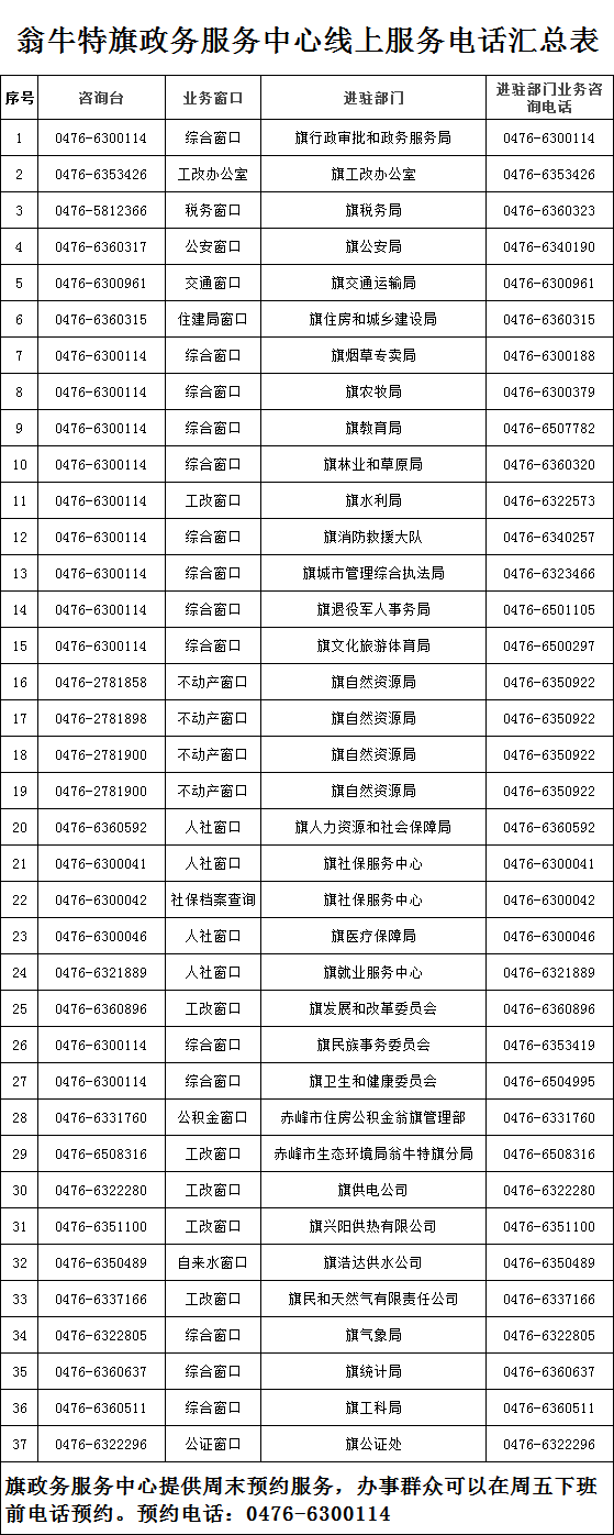 为全面做好我旗政务服务工作,打造更优营商环境,为办事群众提供高效便捷的服务,现将翁牛特旗政务服务中心各业务部门咨询电话进行公布,请广大市民朋友收藏备用。