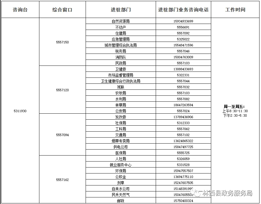 为持续推进优化营商环境,深化放管服改革,全面提升林西县政务服务工作水平,加快推进政务服务标准化、规范化、便利化,为办事群众和企业提供更优的服务质量、更便捷的服务方式,现将林西县政务服务中心各业务部门咨询电话公示如下: