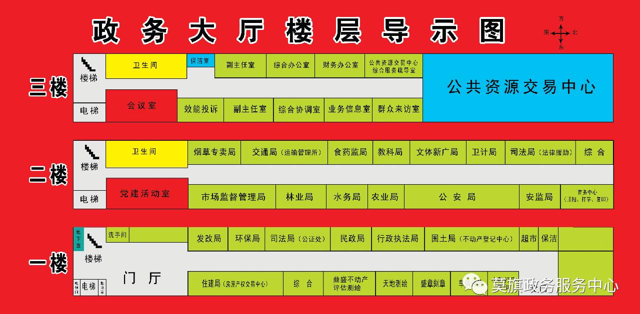 一楼:发改局、环保局、司法局(公证处)、民政局、综合行政执法局、国土局(不动产登记中心)、住建局(房屋产权交易中心)、安监局、文体新广局