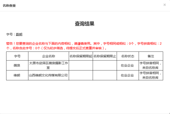 填写完成后,点击[查重],验证是否可以使用该名称。查询结果如图7: