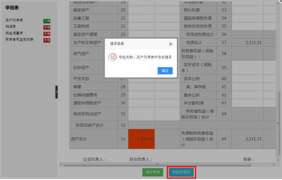 (4)若点击【校验并保存】按钮,系统将校验是否存在数据错误,存在错误则将错误栏标红并给出具体提示信息,此时可根据提示对错误信息进行数据修改。
