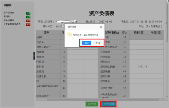 (5)修改数据后,再次点击【校验并保存】,直至提示“校验成功,请及时提交申报”。点击【确定】将退出报表填写页面,点击【关闭】将关闭提示信息对话框,继续停留报表填写界面。
