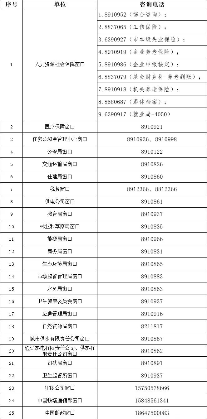 通辽市政务服务中心咨询台 ,周一至周五:8:30-17:30 周六:8:30-12:00 周日:8:30-12:00 (仅受理电话咨询业务)