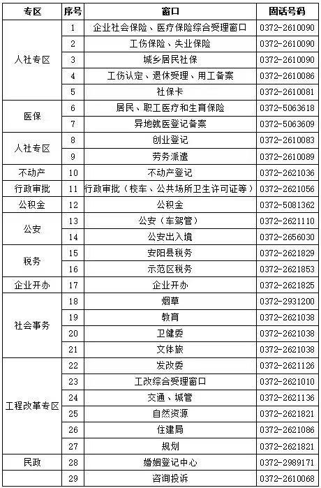 安阳县政务服务和大数据局办公室:0372—2621801;企业开办(市场监管)专区:0372—2621825;不动产登记窗口:0372—2621036;公安局窗口:0372—2621110;