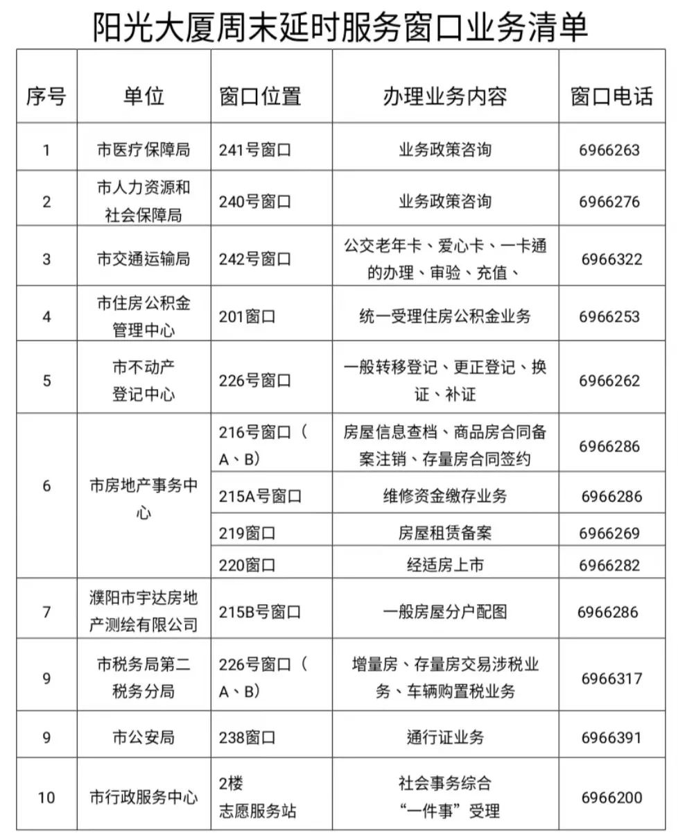 濮阳市行政服务中心(阳光大厦)政务服务大厅窗口咨询电话,医保业务查询、政策咨询电话:8759981,职工退休申报咨询电话:8759963,失业金发放窗口咨询电话:8759993