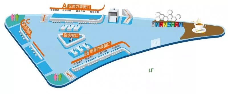 设有导办服务台、自助服务区、综合受理区、统一出件区、咖啡厅等,