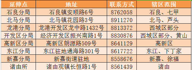 8.分局延伸点业务办理及咨询方式。除办税厅主厅外,在8个乡镇分局设立了办税延伸点,受理所属辖区内纳税人的全部涉税业务办理,方便纳税人就近办理。延伸点的窗口业务办理,也按照上述预约办理要求,采取电话预约方式,错峰办理。8处延伸点地址及咨询预约电话如下: