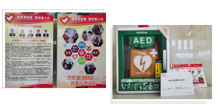 组建5人志愿者队伍,提供热情温馨的志愿服务,投放“救命神器”AED提升中心应急救护能力,更好地保障办事群众的生命安全。
