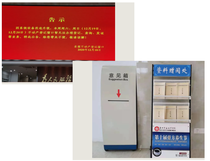 配有LED电子显示屏、资料赠阅处就相关政策法规、通知等内容展示给办事群众。