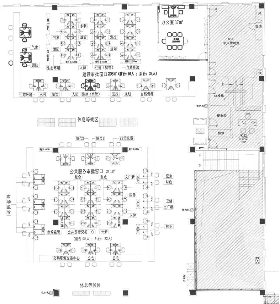 “中心”通过不断完善,现设116个窗口工作人员位子,区划为企业设立注册登记区、建设项目审批收费区、社会事业服务区等功能区的行政服务收费大厅和有大小招投标拍卖厅、专家评标室、询标室、洽谈室等功能厅室的招投标拍卖交易场所。建起了有投资代理服务中心、咨询投诉综合服务台、大型电子显示屏、触摸式电子查询系统、窗口位置引导图、银行收费窗口、大型停车场等服务平台。