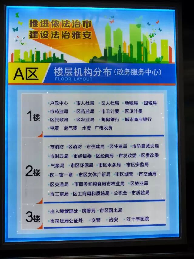 雅安市政务服务中心新大楼分为A、B区,下面是楼层机构分布图,您如果要去办事又怕找不到地方,可以打开静美雨城微信平台看看,免得跑冤枉路。