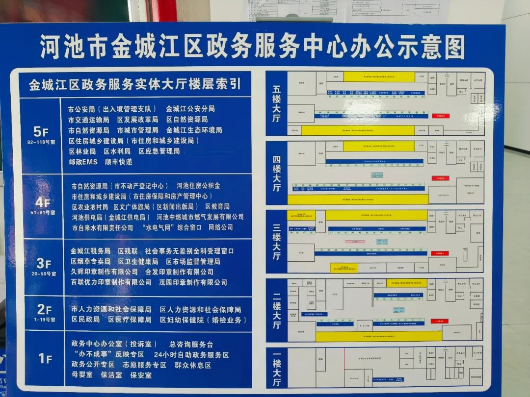 五楼设有公安服务区(市公安局出入境管理支队、金城江公安分局)、项目投资审批窗口(市交通运输局、区发展改革局、区自然资源局、市自然资源局、区住房城乡建设局(市住房城乡建设局)、市城市管理执法局、金城江生态环境局、区林业局、区水利局、区应急管理局、金城江供电局)、快递服务(邮政EMS、顺丰快递)。