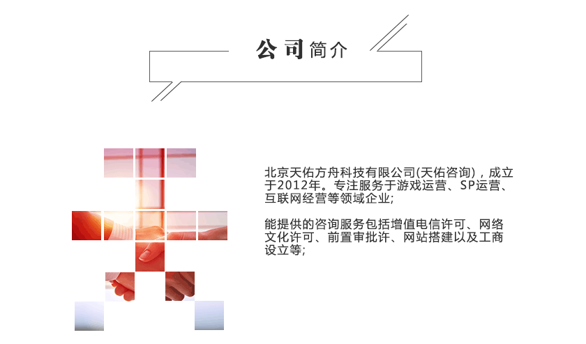北京天佑方舟科技有限公司(天佑咨询),成立于2012年。专注服务于游戏运营、SP运营、互联网经营等领域企业;