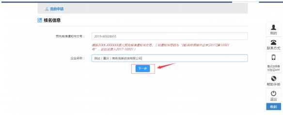 进入【核名信息】校验,按照提示准确输入《名称预先核准通知书》文号(或《告知书》文号)和企业名称。并点击“下一步”。