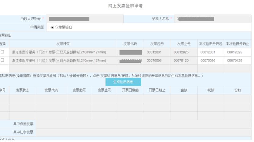 b.纳税人选择需要验旧的发票种类之后,点击“生成验旧信息”,系统自动连接开票系统调取纳税人已上传未验旧的发票明细。