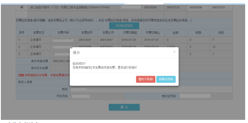 c.确认无误后,点击提交。纳税人发票验旧结束后,系统对纳税人已验旧的发票进行自动扫描,若有红字发票和作废发票,则系统提示“您有未核销的红字发票或作废发票,是否进行核销?1、暂时不核销,2、我要去核销”,纳税人若选择我要去核销则链接至红废票管理模块。