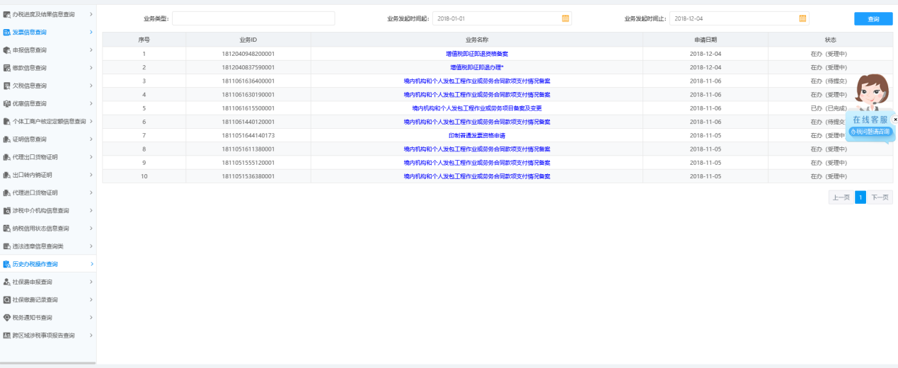 业务办结后,可通过【历史办税操作查询】,查看企业已经办理完成的业务(即状态为已完成、已作废的业务),如下: