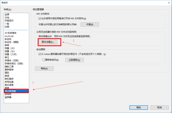在“首选项”界面选择左边的“信任管理器”,然后点击“更改设置”按钮,选择“允许PDF文件访问所有网站”后两次点击确定按钮,再重新进行申报即可。