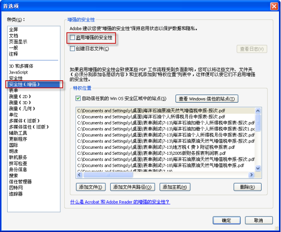 在“首选项”界面选择左边的“安全性(增强)”去掉“启动增强的安全性”复选框前面的勾(注:本操作在同一台电脑上只需设置一次,以后进行申报时可不必重复操作),然后点击确定。