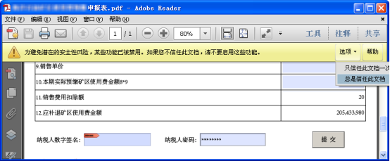 最后在申报表上方的黄色区域点击信任按钮,选择“总是信任此文档”,保存并覆盖原来的文档即可。