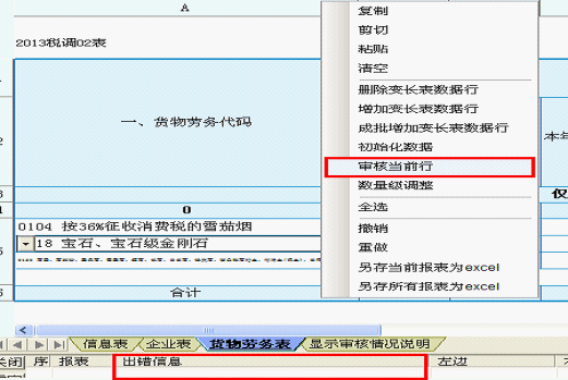 选定某一未通过审核的数据行的任一单元格,点击鼠标右键,在菜单中选择【审核当前行】,系统将在审核窗口中显示审核提示信息。根据提示信息修改数据即可。