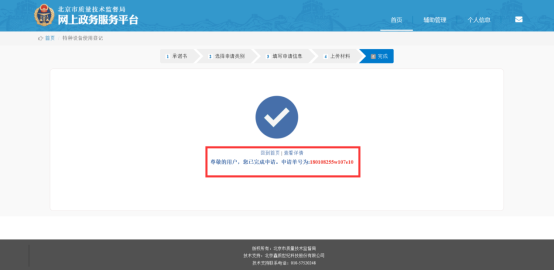 进入【5.完成】界面,用户已经完成申请,而且此界面有申请单号,也可以“回到首页”、“查看详情”等操作。