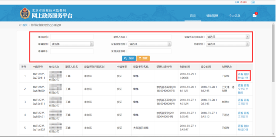 当信息比较多时,用户可以通过“单位名称”、“联系人姓名”、“设备所在行政区划”、“申请类别”、“设备类型名称”、“办理状态”、“申请单号”、“受理决定书号”来进行精确查询。如果信息输入错误,用户可以点击“重置”按钮进行重新输入。