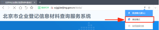 浏览器打开以后默认为极速模式,此时切换“兼容模式”只需按照上图,单击网址栏右侧图标进行选择即可(注意使用过程中,要随时将极速模式切换成兼容模式!)。