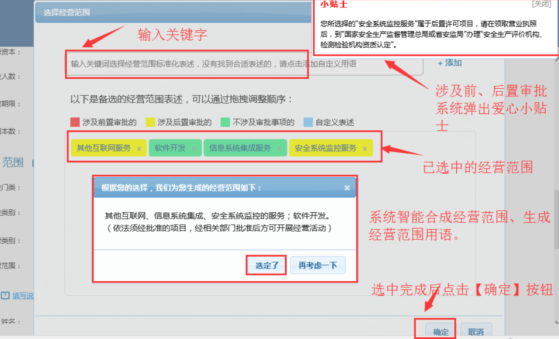【经营(业务)范围】经营范围提供智能填写、动态排序、智能分段,填写完成后,系统即时整合生成经营范围文本,具体操作如下所示;