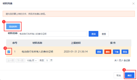 ①点击“上传材料”后,点击“添加材料”,添加完材料后勾选相关材料,点击“确定”