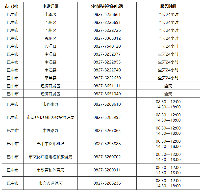 巴中市新冠疫情防控指挥部咨询电话:0827-5256661,