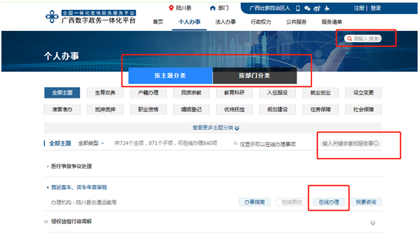 第三步:登录以后根据您需要办理的业务选择对应事项的办事指南进行申报。您可以通过事项类型、事项主题分类等方式快速锁定事项,也可以通过关键词快速检索。
