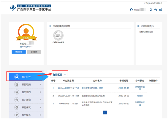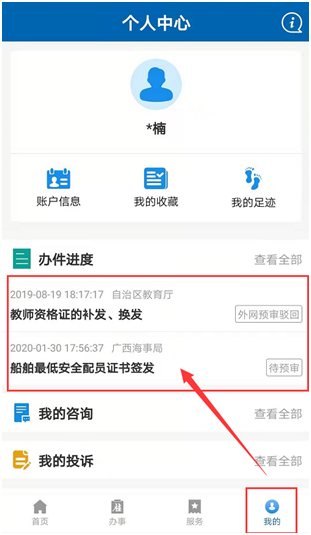 第五步:点击右上角的姓名或法人名称进入个人中心查询办件进度,注意选择办事所属地市。