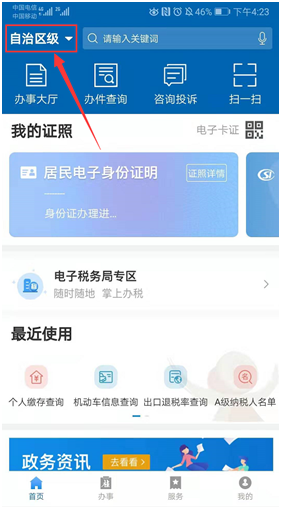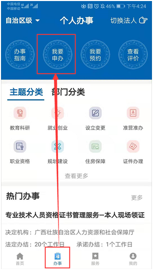 第四步:在“首页”搜索对应事项或者点击下方“办事”菜单查询办事指南进行申报。