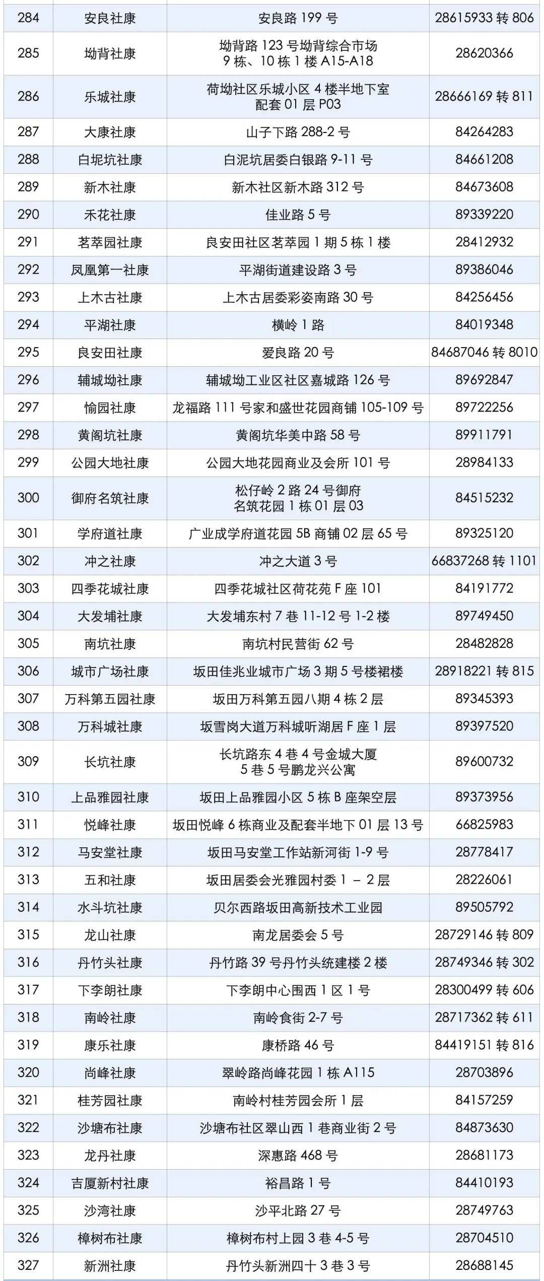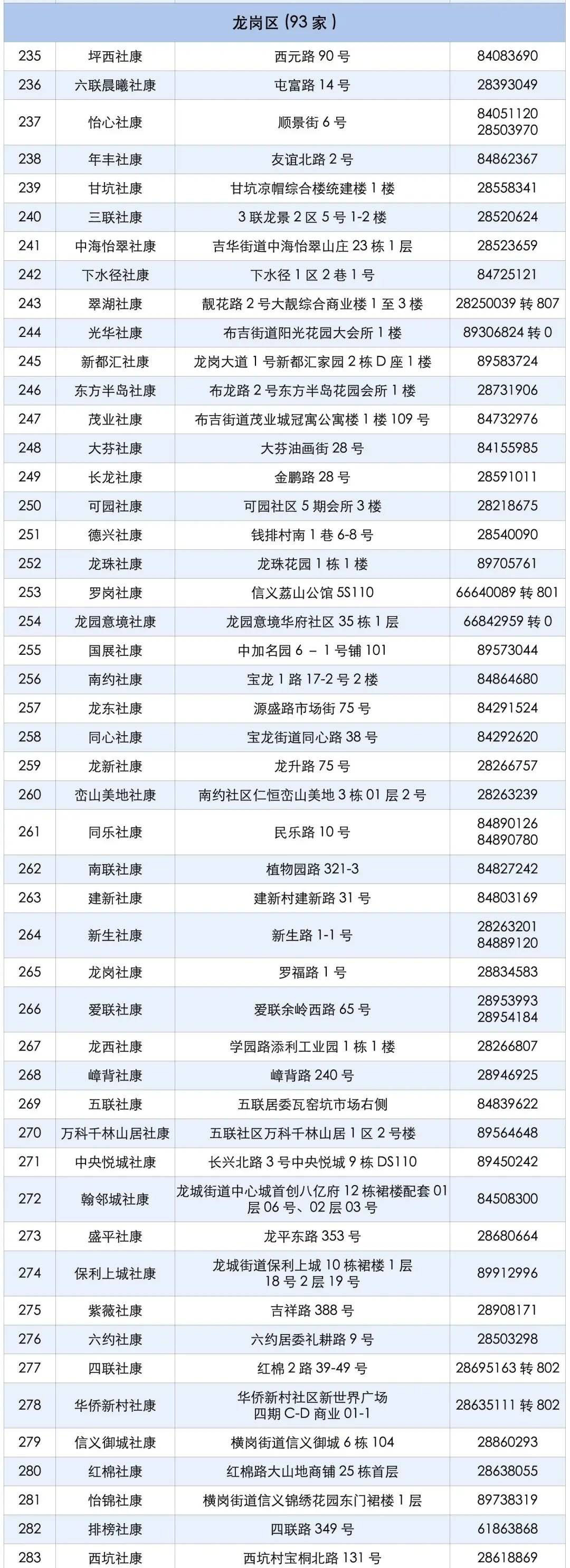 {placeholder tag=p i=290}{placeholder tag=span i=983}{placeholder tag=span i=984}咨询电话:0755-28729146转809{placeholder tag=br i=96} 81、丹竹头{placeholder tag=strong i=1215}社区健康服务中心{placeholder tag=span i=985} {placeholder tag=p i=291}{placeholder tag=span i=986}{placeholder tag=span i=987}接种地址:深圳龙岗区丹竹路39号丹竹头统建楼2楼{placeholder tag=span i=988} {placeholder tag=p i=292}{placeholder tag=span i=989}{placeholder tag=span i=990}咨询电话:0755-28749346转302{placeholder tag=br i=97} 82、下李朗{placeholder tag=strong i=1216}社区健康服务中心{placeholder tag=span i=991} {placeholder tag=p i=293}{placeholder tag=span i=992}{placeholder tag=span i=993}接种地址:深圳龙岗区下李朗中心围西1区1号{placeholder tag=span i=994} {placeholder tag=p i=294}{placeholder tag=span i=995}{placeholder tag=span i=996}咨询电话:0755-28300499转606{placeholder tag=br i=98} 83、南岭{placeholder tag=strong i=1217}社区健康服务中心{placeholder tag=span i=997} {placeholder tag=p i=295}{placeholder tag=span i=998}{placeholder tag=span i=999}接种地址:深圳龙岗区南岭食街2-7号{placeholder tag=span i=1000} {placeholder tag=p i=296}{placeholder tag=span i=1001}{placeholder tag=span i=1002}咨询电话:0755-28717362转611{placeholder tag=br i=99} 84、康乐{placeholder tag=strong i=1218}社区健康服务中心{placeholder tag=span i=1003} {placeholder tag=p i=297}{placeholder tag=span i=1004}{placeholder tag=span i=1005}接种地址:深圳龙岗区康桥路46号{placeholder tag=span i=1006} {placeholder tag=p i=298}{placeholder tag=span i=1007}{placeholder tag=span i=1008}咨询电话:0755-84419151转816{placeholder tag=br i=100} 85、尚峰{placeholder tag=strong i=1219}社区健康服务中心{placeholder tag=span i=1009} {placeholder tag=p i=299}{placeholder tag=span i=1010}{placeholder tag=span i=1011}接种地址:深圳龙岗区翠岭路尚峰花园1栋A115{placeholder tag=span i=1012} {placeholder tag=p i=300}{placeholder tag=span i=1013}{placeholder tag=span i=1014}咨询电话:0755-28703896{placeholder tag=br i=101} 86、桂芳园{placeholder tag=strong i=1220}社区健康服务中心{placeholder tag=span i=1015} {placeholder tag=p i=301}{placeholder tag=span i=1016}{placeholder tag=span i=1017}接种地址:深圳龙岗区南岭村桂芳园会所1层{placeholder tag=span i=1018} {placeholder tag=p i=302}{placeholder tag=span i=1019}{placeholder tag=span i=1020}咨询电话:0755-84157259{placeholder tag=br i=102} 87、沙塘布{placeholder tag=strong i=1221}社区健康服务中心{placeholder tag=span i=1021} {placeholder tag=p i=303}{placeholder tag=span i=1022}{placeholder tag=span i=1023}接种地址:深圳龙岗区沙塘布社区翠山西1巷商业街2号{placeholder tag=span i=1024} {placeholder tag=p i=304}{placeholder tag=span i=1025}{placeholder tag=span i=1026}咨询电话:0755-84873630{placeholder tag=br i=103} 88、龙丹{placeholder tag=strong i=1222}社区健康服务中心{placeholder tag=span i=1027} {placeholder tag=p i=305}{placeholder tag=span i=1028}{placeholder tag=span i=1029}接种地址:深圳龙岗区深惠路468号{placeholder tag=span i=1030} 28681173{placeholder tag=br i=104} 吉厦新村社康{placeholder tag=span i=1031} 深圳龙岗区裕昌路1号{placeholder tag=span i=1032} {placeholder tag=p i=306}{placeholder tag=span i=1033}{placeholder tag=span i=1034}咨询电话:0755-84410193{placeholder tag=br i=105} 89、沙湾{placeholder tag=strong i=1223}社区健康服务中心{placeholder tag=span i=1035} {placeholder tag=p i=307}{placeholder tag=span i=1036}{placeholder tag=span i=1037}接种地址:深圳龙岗区沙平北路27号{placeholder tag=span i=1038} {placeholder tag=p i=308}{placeholder tag=span i=1039}{placeholder tag=span i=1040}咨询电话:0755-28749763{placeholder tag=br i=106} 90、樟树布{placeholder tag=strong i=1224}社区健康服务中心{placeholder tag=span i=1041} {placeholder tag=p i=309}{placeholder tag=span i=1042}{placeholder tag=span i=1043}接种地址:深圳龙岗区樟树布村上园3巷4-5号{placeholder tag=span i=1044} {placeholder tag=p i=310}{placeholder tag=span i=1045}{placeholder tag=span i=1046}咨询电话:0755-28704510{placeholder tag=br i=107} 91、新洲{placeholder tag=strong i=1225}社区健康服务中心{placeholder tag=span i=1047} {placeholder tag=p i=311}{placeholder tag=span i=1048}{placeholder tag=span i=1049}接种地址:深圳龙岗区丹竹头新洲四十3巷3号{placeholder tag=span i=1050} {placeholder tag=p i=312}{placeholder tag=span i=1051}{placeholder tag=span i=1052}咨询电话:0755-28688145;{placeholder tag=br i=108} {placeholder tag=span i=1053} {placeholder tag=p i=313}{placeholder tag=span i=1054} {placeholder tag=p i=314}{placeholder tag=span i=1055}92、怡心{placeholder tag=strong i=1226}社区健康服务中心{placeholder tag=span i=1056} {placeholder tag=p i=315}{placeholder tag=span i=1057}{placeholder tag=span i=1058}接种地址:深圳龙岗区顺景街6号{placeholder tag=span i=1059} {placeholder tag=p i=316}{placeholder tag=span i=1060}{placeholder tag=span i=1061}咨询电话:0755-84051120、28503970{placeholder tag=br i=109}