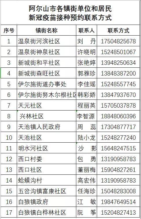 即日起,兴安盟阿尔山市内18岁以上居民(含60岁以上)不论户籍,身体状况符合接种要求的均需免费接种新冠病毒疫苗,请您与所在单位或社区联系疫苗接种相关事宜。零散居民、流动人口也可携带身份证,就近自行前往接种点接种,接种点会根据疫苗供应情况、日接种能力、排队顺序等发放接种序号。注意;接种点开放时间不定时有调整,建议先电话或者网上预约咨询,阿尔山市新冠病毒疫苗接种单位名单、地址、接种时间和预约电话等相关信息请看这里↓↓↓