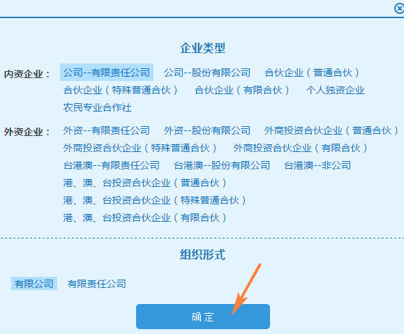 在弹出框中先选择“企业类型”在选择“组织形式”,点击确定