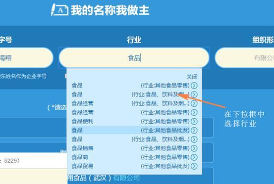 利用模糊查询的方式进行选择,例在行业中录入“食品”,自动显示出与其有关的行业类别,并依据提示选择企业所属行业。如果名称中不显示行业,请勾选“无行业描述选项”。