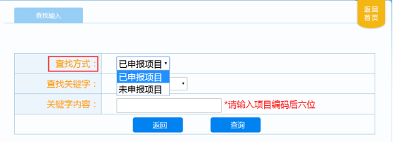 进入到下图找回界面,查找方式分为两种:已申报项目和未申报项目,申请人选择【查找方式】之后,【查找关键字】下拉框中会有对应选项,选择【查找关键字】后,输入【关键字内容】,点击“查询”按钮即可。