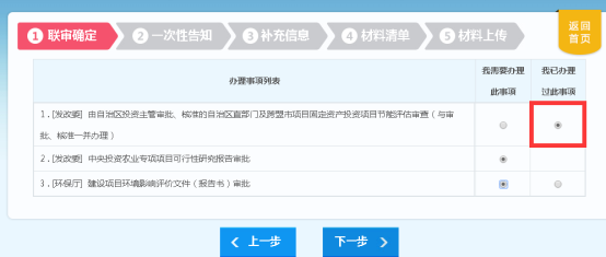 3)选择联审确定时的问题时一定要如实选择,避免出现无法提供材料的情况以及增减了联审部门,同时注意如果办理过此事项,则要在联审确定时点击“我已办理过此事项”,这样就不需要该部门再进行审批(已经给项目单位出过批文)。