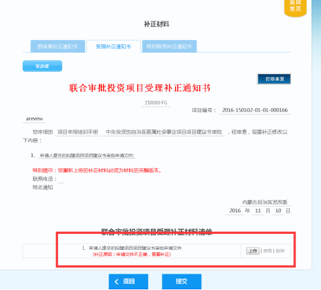 当提交的材料不正确时,审批部门会发送补正通知书,需要项目单位对材料进行补正修改。