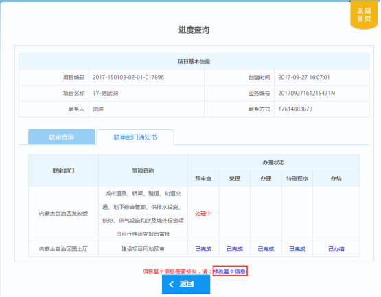 注意:联办的项目,例如建议书办结后,申报可研,在受理环节修改了项目名称等信息,则建议书的相关信息不会修改。
