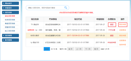 项目单位点击“修改申报”,会提示退回的原因,再点击“修改申报”按钮,从【填写基本信息】处开始重新申报。