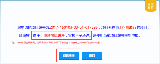 当申报时选择的事项层级或事项不正确时,审批部门会做“终审审核不通过”处理,需要项目单位重新进行申报,项目单位在【项目信息】里点击申报的事项阶段,就可以查看回退的项目。